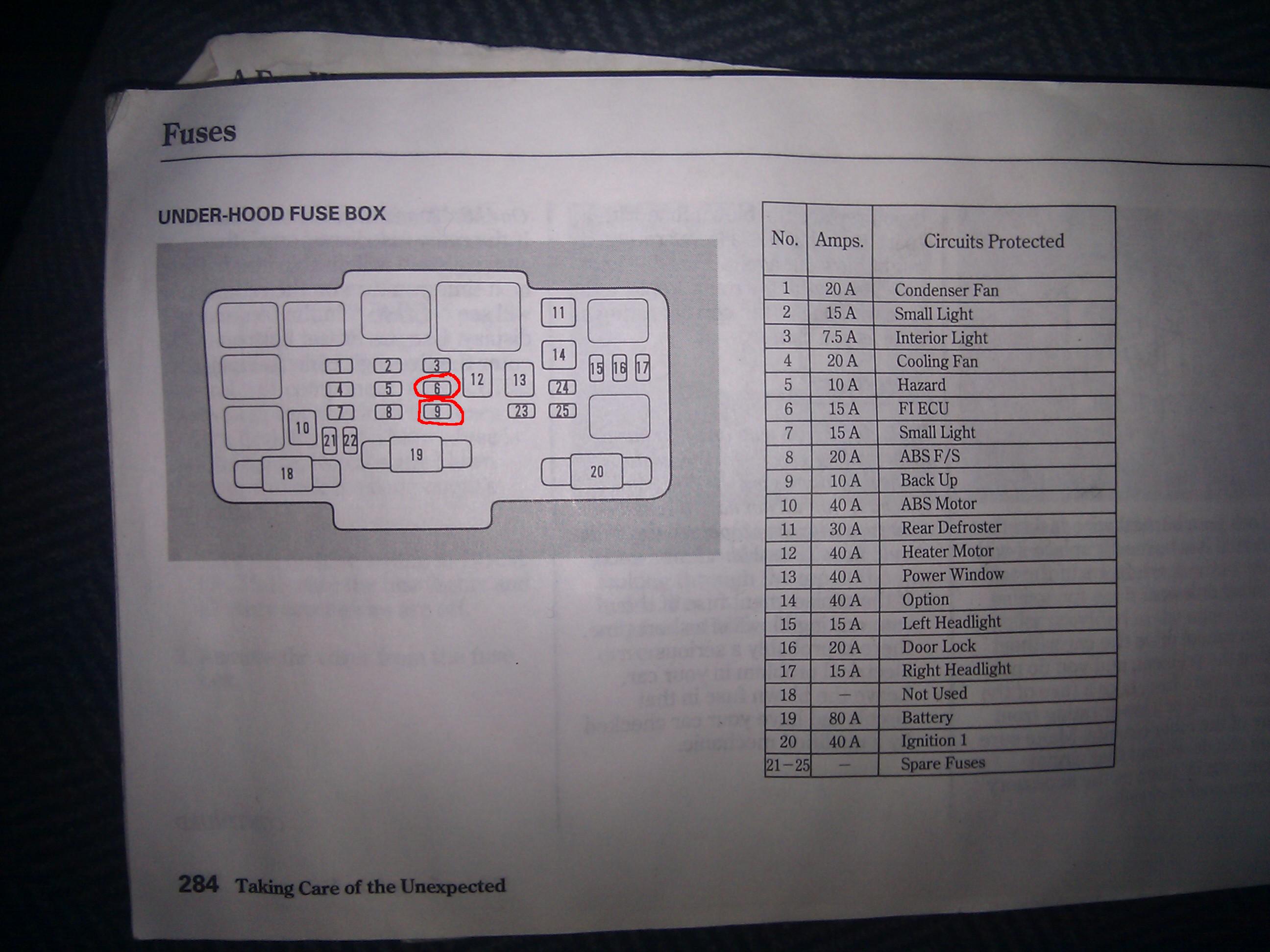 The 2 fuses are very poorly named, you would probably never even think to check them to correct the problem at hand. They are the 15A FI ECU Fuse - No. 2 in the chart below, and the 10A Back Up Fuse - No. 9 in the chart below. As you pop them out, have a look at them - you should see that the metal that runs through the plastic is broken (this indicated that the fuse is blown.)
