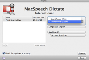 First, get Macspeech Dictate. It's available for sale at www.macspeech.com, and you can save 10% on MacSpeech Dictate with Microphone by using coupon MACSPEECH during checkout. Once its loaded up it will ask you to create a profile by selecting a microphone. The stock Dictate application will not let you select your internal mic to be used as an audio input source. To get around this, we have to download two applications, the latest version of Soundflower from http://code.google.com/p/soundflower/downloads/list and LineIn from http://rogueamoeba.com/freebies/.