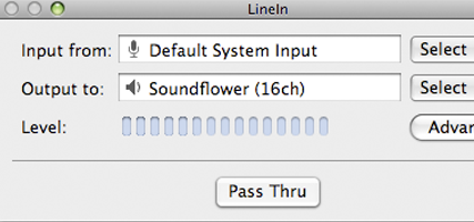 Now go to LineIn and route the internal mic to Sounflower we select "Default System Input" and Output " Soundflower (16ch)" then click "Pass Thru".