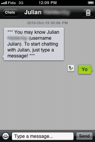 What is left over is a sleek, intuitive, and multi-OS messenger service that, in this writer’s opinion, beats Black Berry Messenger (BBM). The app is available for Blackberry, Android, Iphone or even your Ipod touch. It has the leg up on SMS as it’s free and you have the BBM-like read receipts available. For those who don’t use BBM, this is a feature notifies the sender of the message when it has been sent to the recipient, once the message has been delivered and finally, and finally when it has been read by the user. The messages status is indicated by the little icon left of the sent message, reading either S for sent, D for delivered or R for read.
